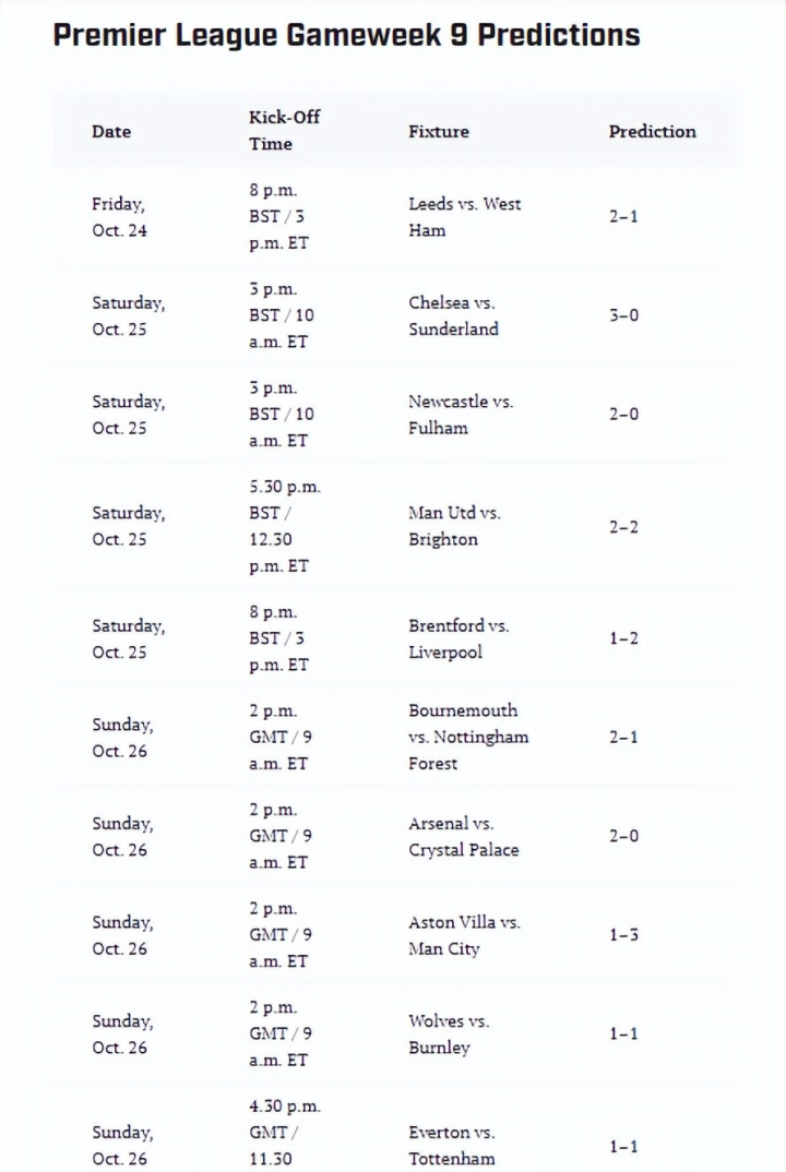 利兹联2-1西汉姆联 切尔西3-0桑德兰 纽卡斯尔2-0富勒姆 曼联2-2布莱顿 布伦特福德1-2利物浦 伯恩茅斯2-1诺丁汉森林 阿森纳2-0水晶宫 阿斯顿维拉1-3曼城 狼队1-1伯恩利 埃弗顿1-1托特纳姆热刺 保罗-默森预测